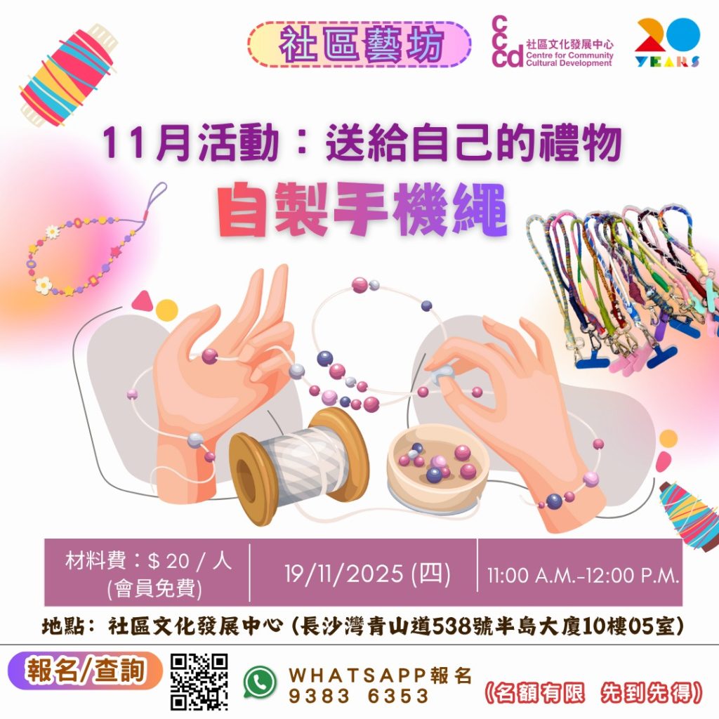 📍 地點: 社區文化發展中心(長沙灣青山道538號半島大廈10樓05室)