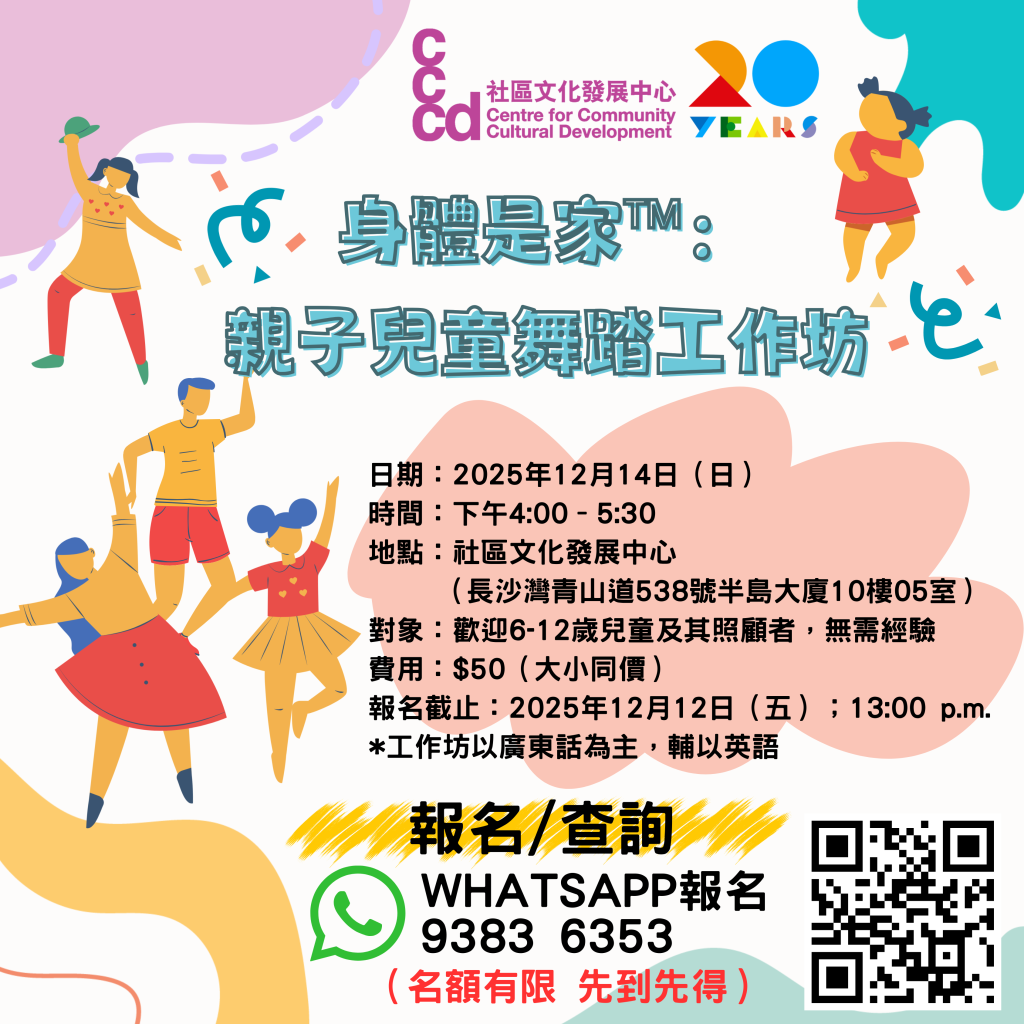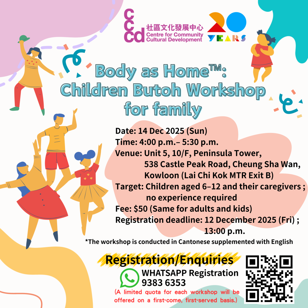 假如身體是家,家長該如何教導孩子,好好住在自己身體的家? 本工作坊以兒童故事形式簡述舞踏起源,結合感統遊戲、創意舞蹈、太極導引、基礎武術,參照腦神經科學、兒童發展理論、情緒調節技法,讓孩子及其照顧者,在歡笑、勇氣與創意之中,學習如何好好愛自己與他人。歡迎神經多元及不同能力人士參與。