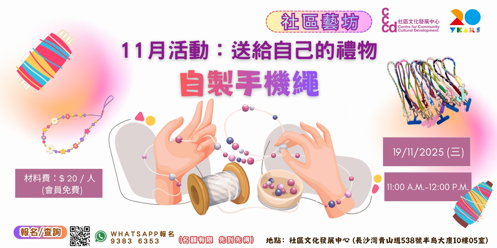 在忙碌的生活中,給自己一份小小的禮物,為自己的手機增添一抹獨特的風格!這個活動不僅讓你學習製作精美的手機繩,還能認識志同道合的朋友,分享創作的樂趣。